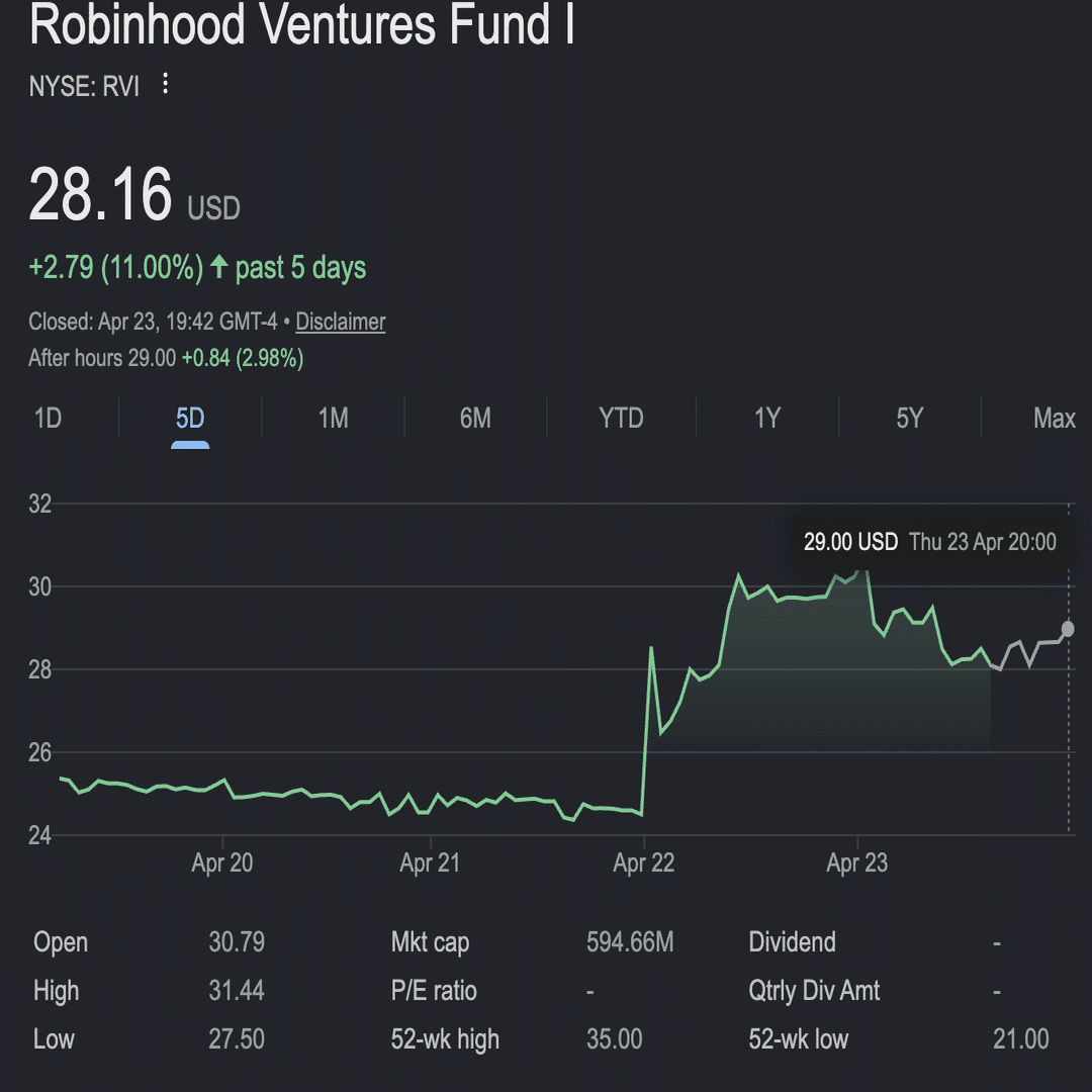 現在ナスダックに$RVIというティッカーで上場しているファンドがあります。ロビンフッドが運用するクローズドエンド型のベンチャーファンドで、2026年3月に上場したば